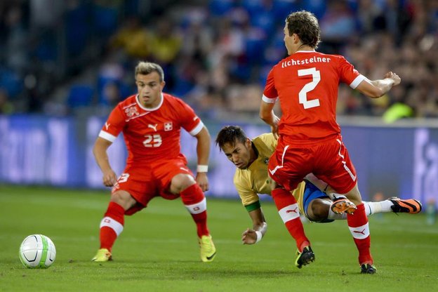 O Brasil fazia faltas duras nos suíços, principalmente com Neymar e Marcelo.